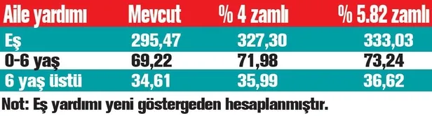 Eş yardımına ayrıca bir artış da yeni göstergeden gelecek. Eş yardımı 295,47 liradan 333,03 liraya, çocuk yardımı 73,24, üstü için 36,62 liraya çıkabilecek.