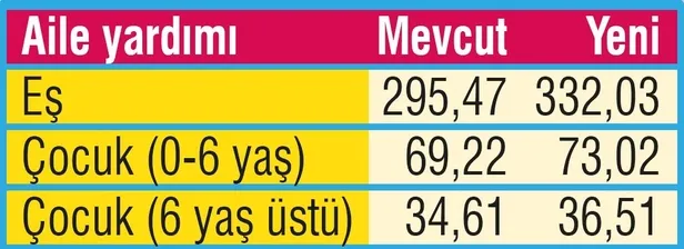 Maaş katsayısındaki artış aile yardımını da artırdı. Ayrıca eş yardımına hakem kurulu kararı kapsamında gösterge zammı da geldi. Eş için verilen aile yardımı ödeneğinin göstergesi 2.134'ten 2.273'e yükseldi. Memur maaş katsayısı ile belirlenen göstergenin çarpımıyla hesaplanan eş yardımı 332,03, çocuk yardımı ise 0-6 yaş arasında 73,02, 6 yaş üstünde 36,51 liraya çıktı. Eşi çalışmayan, 0-6 yaş arası 2 çocuğu olan memur 433,91 lira alıyordu. Bu tutar 478,07 liraya yükseldi.
