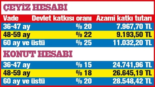 Konut ve çeyiz hesabında devlet katkısı bu yıl arttı. Evlenirken 11 bin 32, ev alırken 28 bin 548 lira destek imkanı var. Çiftler ayrı ayrı yararlanıp tutarı katlayabiliyor...