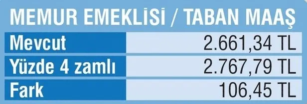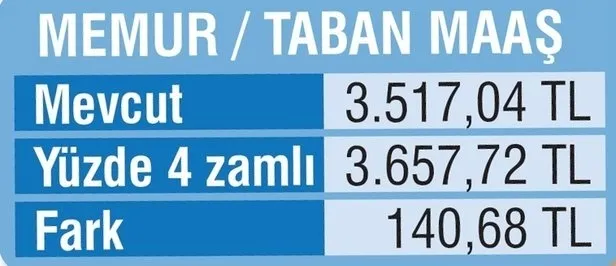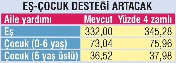 Yüzde 4'lük artışa göre aile yardımı hariç en düşük memur maaşı 3 bin 517 liradan 3 bin 658 liraya yükselecek. Eş yardımı 332 liradan 345,28 liraya, çocuk yardımı da 0-6 yaş arası için 73,04 liradan 75,96, üstü için 36,52 liradan 37,98 liraya çıkacak.. Eşi çalışmayan, 0-6 yaş arası 2 çocuğu olan memur aylık 478,08 lira alırken, bu tutar 497,20 liraya yükselecek. En düşük memur emeklisi aylığı ise 2 bin 661 liradan yüzde 4 zam ile 2 bin 767 liraya ulaşacak..