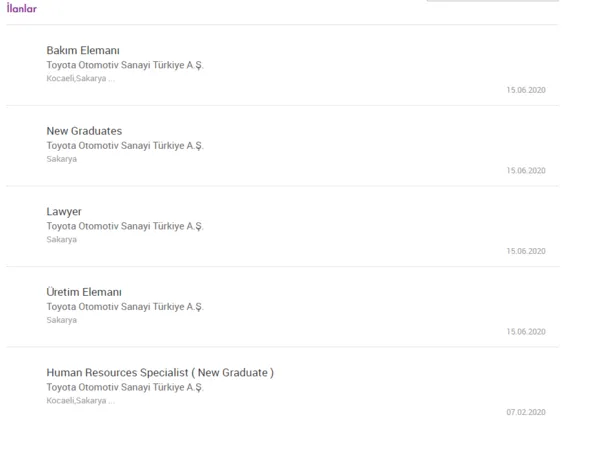 Sakarya Çalışma ve İş Kurumu İl Müdürlüğü, Toyota Otomotiv Sanayi Anonim Şirketi 17 Haziran tarihinde güvenlik görevlisi kadrosunda bir ilan açıkladı. Bu ilanda 1 kişilik güvenlik görevlisi alımına 60'tan fazla kişi başvuru yaparak talep karşılandı. Yeni ilanlar ise kariyer portalı üzerinden devam etti. Sakarya'da alınacak eleman kadrolarında; bakım elemanı, üretim elemanı, New Graduates, New Graduates ve Human Resources Specialist Kadrosunda istihdam gerçekleştirilecek. Bu alımların başvuruları kariyer portalı üzerinden yapılacak. Üretim elemanı alımında Başvuru şartları şu şekilde;