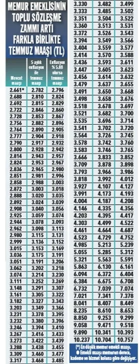 Milyonlarca emekli, memur, dul ve yetim herkesi ilgilendiriyor. İlk veriler ortaya çıktı. Zamları belli oluyor, işte kuruşu kuruşuna zamlı maaşlar... Tüm emeklilerin hem maaşları hem de her ay aldıkları ek ödemeleri Temmuz ayında artacak. Ayrıca doktorluktan emekli olanlar üçüncü zammı, 2 bin 86-2 bin 609 liraya yükselecek ilave ödemelerinde görecek... Ödemenin tutarı; uzman olmayanlarda bin 898, uzman olanlarda ise 2 bin 483 lira seviyesinde bulunuyor. Temmuz'da ise tüm ödemeler değişecek. SSK emeklilerinin maaşına ilk 6 aylık enflasyon oranında zam yapılırken; memur emeklilerine yüzde 4 artış ve ilk 6 aylık enflasyon yüzde 4'ü aşarsa fark yansıtılacak. Emekli maaşlarıyla ilgili son dakika haber ve gelişmeler takvim.com.tr'de...