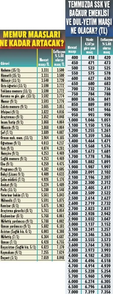 Diğer yandan SSK ve Bağkur emeklilileri ise tahminler doğrultusunda bir enflasyon artışı olursa yüzde 5.08 oranında zam alacak.