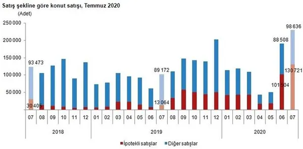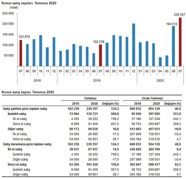 Ocak-Temmuz döneminde 854 bin 126 konut satışı gerçekleşerek, bir önceki yılın aynı dönemine göre %40,5 artış gösterdi. Ocak-Temmuz döneminde ipotekli konut satışı %313,9 artarak 397 bin 95, diğer satış türlerinde ise %10,8 azalarak 457 bin 31 oldu. Bu dönemde ilk defa satılan konutlar %8,4 artarak 265 bin 709 oldu. İkinci el konut satışları da %62,1 artarak 588 bin 417 olarak gerçekleşti.