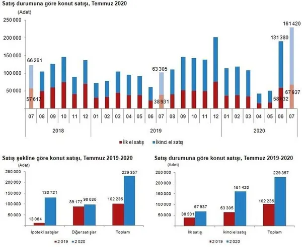 Türkiye genelinde ikinci el konut satışları 2020 Temmuz ayında bir önceki yılın aynı ayına göre %155,0 artış göstererek 161 bin 420 oldu. İkinci el konut satışlarında İstanbul 29 bin 3 konut satışı ve %18,0 pay ile ilk sıraya yerleşti. İstanbul'daki toplam konut satışları içinde ikinci el satışların payı %73,6 oldu. Ankara 20 bin 530 konut satışı ile ikinci sırada yer aldı. Ankara'yı 11 bin 90 konut satışı ile İzmir izledi.