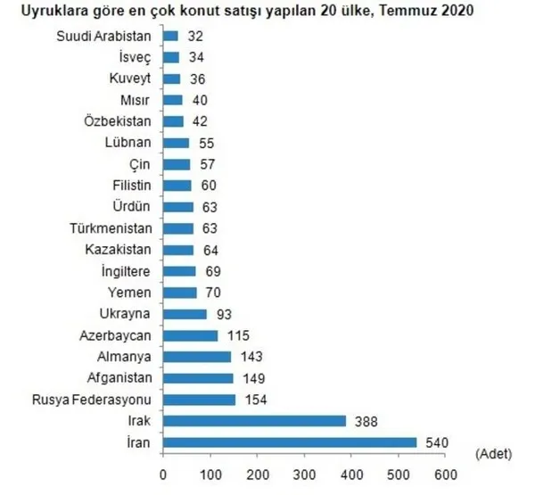 Temmuz ayında İran vatandaşları Türkiye'den 540 konut satın aldı. İran'ı sırasıyla, 388 konut ile Irak, 154 konut ile Rusya Federasyonu, 149 konut ile Afganistan ve 143 konut ile Almanya izledi.