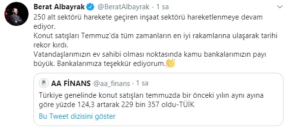 Konuyla ilgili açıklamalarda bulunan Hazine ve Maliye Bakanı Berat Albayrak, "250 alt sektörü harekete geçiren inşaat sektörü hareketlenmeye devam ediyor. Konut satışları Temmuz'da tüm zamanların en iyi rakamlarına ulaşarak tarihi rekor kırdı. Vatandaşlarımızın ev sahibi olması noktasında kamu bankalarımızın payı büyük. Bankalarımıza teşekkür ediyorum" ifadelerini kullandı.