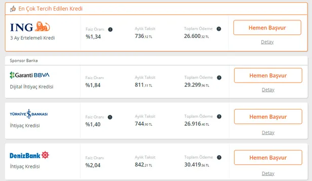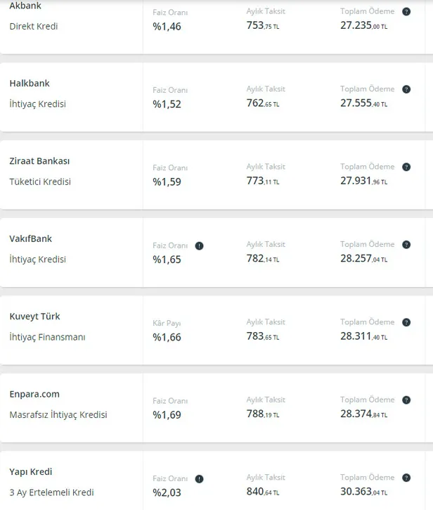 DİĞER BANKALARIN 20.000 KREDİ FAİZ ORANLARI