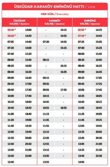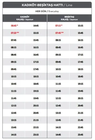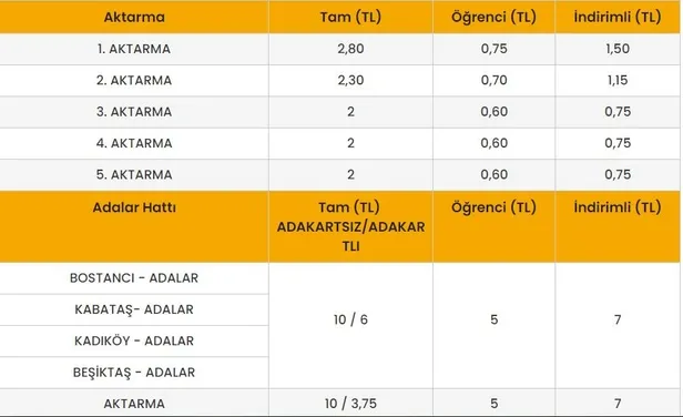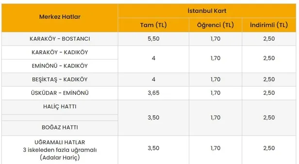 Karaköy, Bostancı, Eminönü, Üsküdar, Haliç, Boğaz Hattı gibi güzergahlara göre fiyat değişiklik gösteriyor. Ayrıca tam, öğrencili akbili ve aktarma gibi detaylara göre de fiyatlar farklılık gösteriyor.