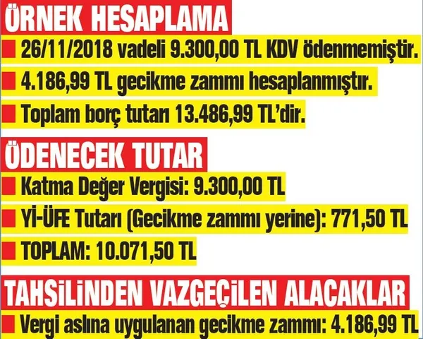 Vatandaş borcunu taksitlendirmek isterse ana para ve Yİ-ÜFE'den oluşan tutar, seçilen taksit sayısına göre belirlenen katsayılarla çarpılacak. 18 aya varan taksit imkanı olacak. Ancak ödemeler 2 ayda bir yapılacağından borçlar 36 aya varan süreyle kapatılacak.