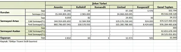 Türkiye Odalar ve Borsalar Birliği'nin çıkardığı Türkiye Ticaret Sicili Gazetesi'ndeki veriler, koronavirüs pandemisinin olumsuz etkisine rağmen 2020 yılında, toplam 102 bin 794 yeni şirketin açıldığını, 15 bin 949 işletmenin ise kapandığını gözler önüne seriyor. Verilere göre, kapanan işletmelerden çoğu ya birleşme ya da faaliyet alanını değiştirme yoluna gitti.