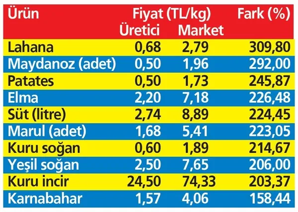 Bayraktar, üreticide 68 kuruş olan lahananın 2,79 liraya, 50 kuruş olan maydanozun 1,96 liraya, 50 kuruş olan patatesin 1,73 liraya, 2,20 lira olan elmanın 7,18 liraya, 2,74 lira olan sütün 8,89 liraya, satıldığını belirtti.