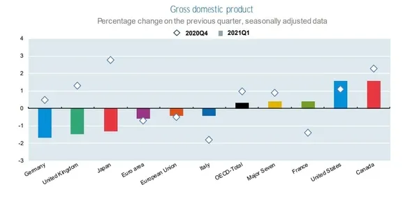 Birinci çeyrek büyüme verisi açıklanan OECD ülkelerinden ekonomisi en fazla daralan ülke yüzde 6,1 ile Birleşik Krallık oldu. Geçici verilere göre Almanya ve Meksika ekonomileri yüzde 3,1 küçüldü.