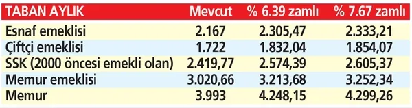 En düşük emekli aylığı; yüzde 7.67 artışla esnafta 2 bin 333, çiftçide bin 854, memurda 3 bin 252, 2000'den önce emekli olan SSK'lılarda 2 bin 605 liraya yükselecek.