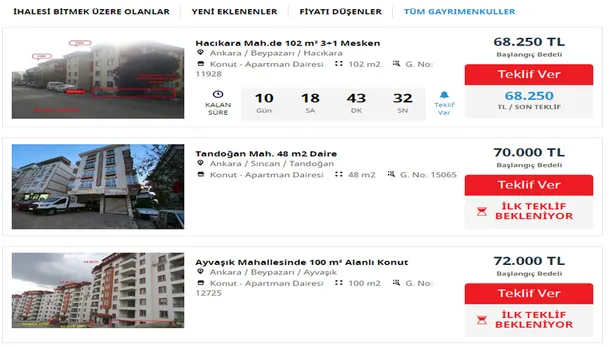 Bankaların takibe düşen kredi miktarı rekor seviyelere ulaşırken yaşanan bu olumsuzluk konut stoklarında da yükselişe neden oldu. Bu anlamda Ziraat Bankası, Halkbank, Vakıfbank, Denizbank ve İş Bankası konut satış ilanları oldukça ilgi çekiyor. Ziraat Bankası'ndan satılık daire, arsa ve işyeri alımı için Ziraat Bankası internet sitesi üzerinden verilen ilanlara teklif verilmesi gerekiyor. Sisteme giriş yaptıktan sonra teklif ver butonuna basarak satılık konut için teklif verirsiniz. Son teklif veren kişinin üzerine 30 dakika boyunca yeni bir teklif gelmemesi halinde konut satışı tamamlanmış olur. Ancak yeni bir teklif verilmesi halinde bu süre otomatik olarak 30 dakika daha uzar.