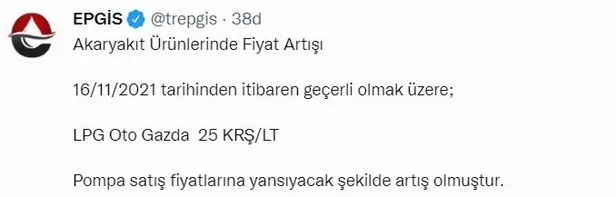 Enerji Petrol Gaz İkmal İstasyonları İşveren Sendikası (EPGİS), tarafından yapılan açıklamaya göre, otogaz fiyatlarına bu gece yarısından itibaren geçerli olmak üzere 25 kuruşluk zam yapıldı.