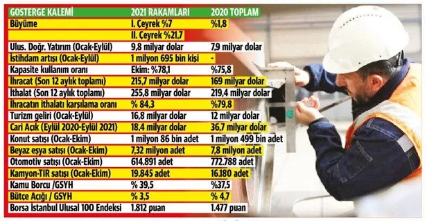 Ülke ekonomisinin bütün alt kalemlerinin yansıması olan büyüme rakamında Türkiye bu yıl zirveye oynuyor. Zorlu pandemi yılında yüzde 1,8 büyüyen Türkiye, bu yıl ilk çeyrekte yüzde 7, ikinci çeyrekte ise yüzde 21,7 büyüme kaydetti. Haftaya açıklanması beklenen üçüncü çeyrek büyümesinin de çift haneli olması bekleniyor. Büyümenin önce göstergeleri yılın son çeyreğinde de güçlü büyümenin sürdüğünü gösteriyor. Türkiye'nin 2021'i yüzde 9-10 bandında bir büyümeyle kapatması bekleniyor.