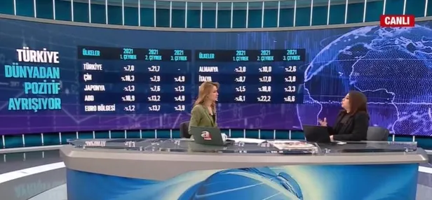 Büyüme rakamlarını değerlendiren A Para Yayın Koordinatörü Özlem Doğaner, Türkiye'nin dünyadan pozitif ayrıştığını belirtti. Doğaner, "Çin'de yüzde 4.9'luk büyüme oldu 3. çeyrekter, ABD'de de yüzde 4.9. İtalya'da 3.8, Fransa'da 3.3'lük Almanya'da 2.6'lık büyümeler var. Yüzde 7.4'lük büyüme oldukça önemli bir büyüme olarak karşımıza çıkıyor" dedi.