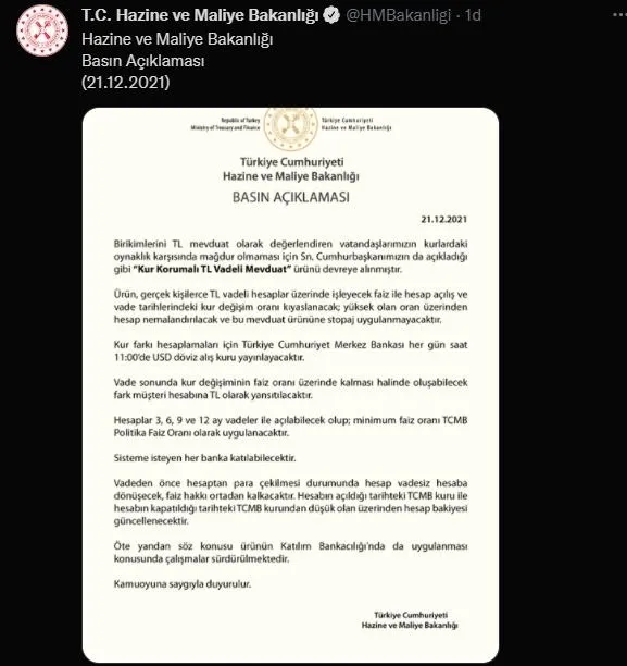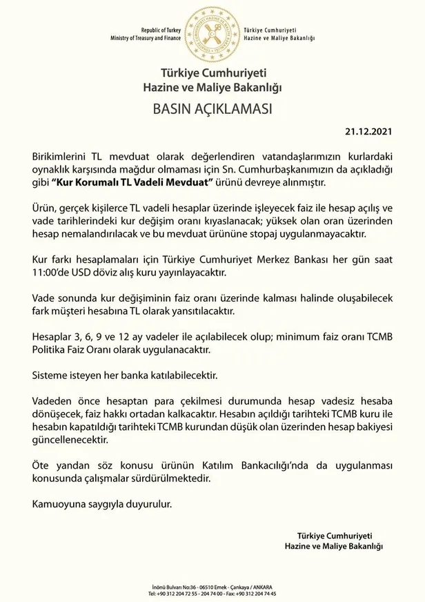 Bakanlıktan yapılan yazılı açıklamaya göre, birikimlerini TL mevduat olarak değerlendiren vatandaşların kurlardaki oynaklık karşısında mağdur olmaması için Başkan Recep Tayyip Erdoğan'ın açıkladığı gibi "Kur Korumalı TL Vadeli Mevduat" ürünü devreye alındı.