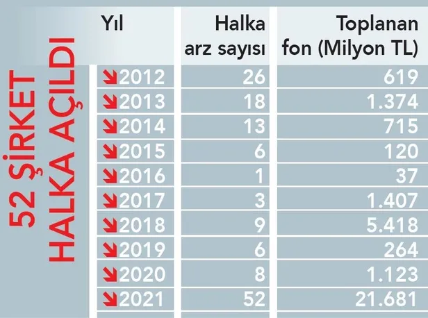 Hisse senedi piyasasında 2021 yılında halka arzlarda hem şirket sayısında, hem TL bazında gelirde, hem de getiride tarihi rekorlar kırıldı. Geçen yıl 52 şirketin gerçekleştirdiği halka arzların büyüklüğü 21.7 milyar liraya ulaştı.