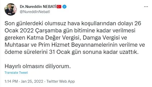 "Son günlerdeki olumsuz hava koşullarından dolayı 26 Ocak 2022 Çarşamba gün bitimine kadar verilmesi gereken KDV, damga vergisi ile muhtasar ve prim hizmet beyannamelerinin verilme ve ödeme sürelerini 31 Ocak gün sonuna kadar uzattık. Hayırlı olmasını diliyorum."