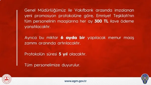 Emniyet Genel Müdürlüğü, tüm polis teşkilatının maaşlarına aylık 300 lira ilave ödeme yapılacağını açıkladı. İlave ödeme miktarı 6 ayda bir yapılacak memur Maaş zammı oranında da artırılacak. Yapılan protokolün süresi ise 5 yıl geçerli olacak.