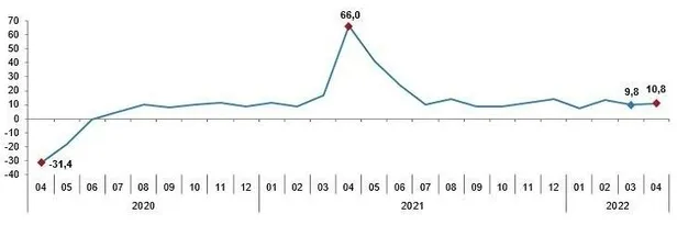 Buna göre, nisanda takvim etkisinden arındırılmış sanayi üretim endeksi, geçen yılın aynı ayına göre yüzde 10,8 yükseldi. Arındırılmamış sanayi üretim endeksinde de yıllık bazda yüzde 10,5 artış oldu.