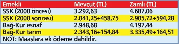 En düşük emekli aylığı Bağ- Kur esnaf emeklilerinde 2 bin 948 liradan 4 bin 197, 2000'den önce emekli olan SSK'lılarda 3 bin 292 liradan 4 bin 687 liraya yükseldi.