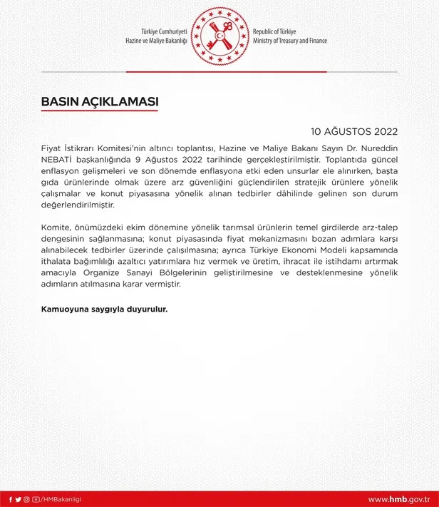 Toplantıya ilişkin Hazine ve Maliye Bakanlığından yapılan açıklamada da Komite toplantısında güncel enflasyon gelişmelerinin ve son dönemde enflasyona etki eden unsurların ele alındığı belirtildi.