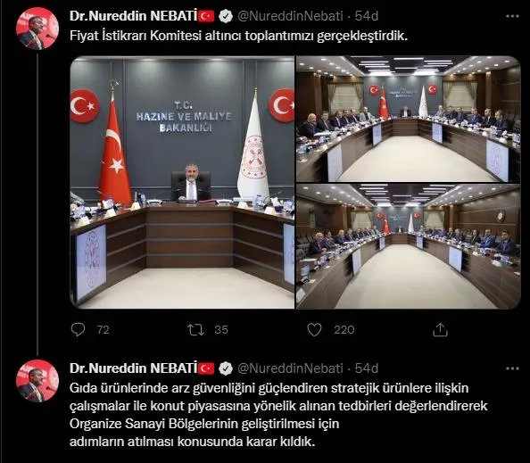 Fiyat İstikrarı Komitesinin 6'ncı toplantısı dün Hazine ve Maliye Bakanı Nureddin Nebati'nin başkanlığında gerçekleştirildi. Nebati, bugün Twitter hesabından yaptığı paylaşımda, toplantıda alınan kararlara ilişkin bilgi verdi.