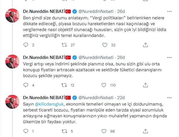 Sayın Kılıçdaroğlu, ekonomik temelleri olmayan ve içi doldurulmamış, serbest ticareti bozucu, fiyatları manipüle eden tarzda siyasi sorumluluk anlayışına sığmayan konuşmalarınızın yıkıcı muhalefet yapmanızın dışında ülkemize bir faydası yoktur.