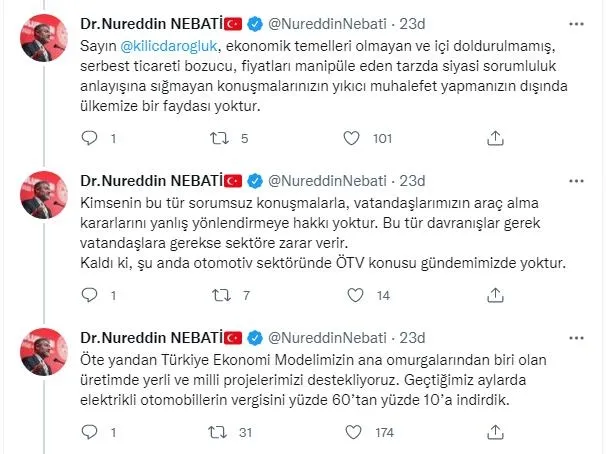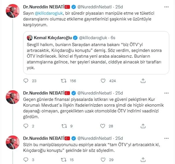 Hazine ve Maliye Bakanı Nureddin Nebati, CHP Genel Başkanı Kemal Kılıçdaroğlu'nun “ÖTV” üzerinden girşitiği manipülasyon girişimine sert tepki gösterdi. Kılıçdaroğlu'nun piyasaları manipüle etme ve tüketici davranışlarını olumsuz etkileme gayretinde bulunduğunu söyleyen Nebati, "Sayın Kılıçdaroğlu, ekonomik temelleri olmayan ve içi doldurulmamış, serbest ticareti bozucu, fiyatları manipüle eden tarzda siyasi sorumluluk anlayışına sığmayan konuşmalarınızın yıkıcı muhalefet yapmanızın dışında ülkemize bir faydası yoktur" ifadelerini kullandı.