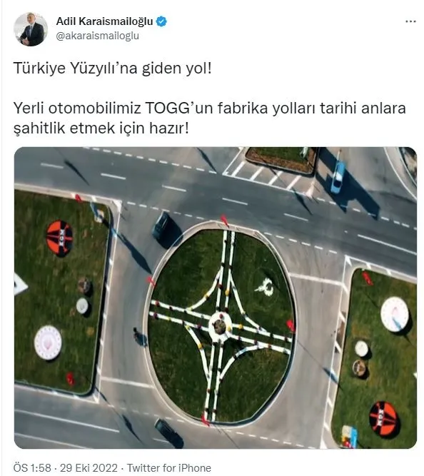 Bakan Karaismailoğlu, sosyal medya hesabından yaptığı paylaşımında, "Türkiye Yüzyılı'na giden yol! Yerli otomobilimiz Togg'un fabrika yolları tarihi anlara şahitlik etmek için hazır!" ifadesini kullandı.