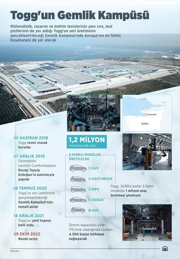 Türkiye'nin Otomobil Girişim Grubu, TOBB koordinasyonunda, Anadolu Grubu, BMC, Kıraça Holding, Turkcell Grubu ve Zorlu Holding ortaklığı ile 2019 yılında ilk adımı atılan, 18 Temmuz 2020'de ise temeli atılan Gemlik TOGG Fabrikası Başkan Erdoğan'ın katıldığı törenle bugün açıldı.