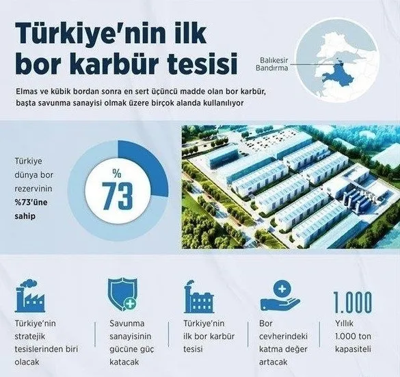 Türkiye'nin ilk bor karbür tesisi Balıkesir'in Bandırma ilçesinde faaliyete başladı. Açılışta konuşan Cumhurbaşkanı Erdoğan, "Yatırım bedeli 80 milyon doları bulan Bandırma Bor Karbür Üretim Tesisi, bu alanda ülkemizin ilk, dünyanın sayılı işletmelerinden biri olacaktır." dedi