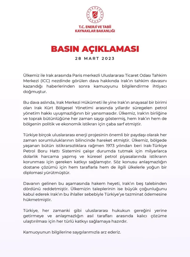 Bakanlıktan yapılan açıklama şu şekilde: "Ülkemiz ile Irak arasında Paris merkezli Uluslararası Ticaret Odası Tahkim Merkezi (ICC) nezdinde görülen dava hakkında Irak'ın tahkim davasını kazandığı haberlerinden sonra kamuoyunu bilgilendirme ihtiyacı doğmuştur.