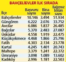 Hükümetin sağlıksız yapı stokunu yenilemek için başlattığı yüzyılın dönüşüm hamlesine vatandaştan yoğun ilgi gelmeye devam ediyor. 1 hafta önce başlayan kampanyaya toplam 34 bin 425 binada, 446 bin 577 bağımsız bölüm için başvuru yapıldı. Bahçelievler, en çok başvuru yapılan ilçe oldu. İlçeden 3 bin 494 bin binada 52 bine yakın bağımsız bölüm için başvuru yapıldı.