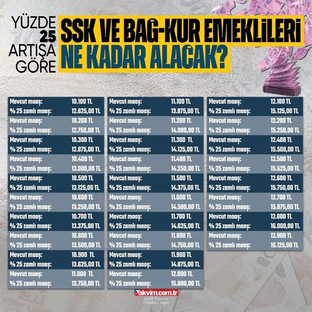 Son dakika haberi... SSK ve Bağ - Kur emeklilerine enflasyon ve refah payı ile birlikte 6 aylık yüzde 25 zam Türkiye Büyük Millet Meclisi (TBMM) Genel Kurulu'nda kabul edildi. Öte yandan düzenlemeyle en düşük memur maaşı 22 bin 17 liraya çıkarıldı. Peki, %25'lik zam ile birlikte hangi emekli ne kadar maaş alacak? Zamlı emekli maaşları ne zaman hesaplara yatırılacak? Takvim.com.tr torba yasaya ilişkin detayları derleyip kuruşu kuruşuna yeni emekli maaşlarını sizler için hesapladı.