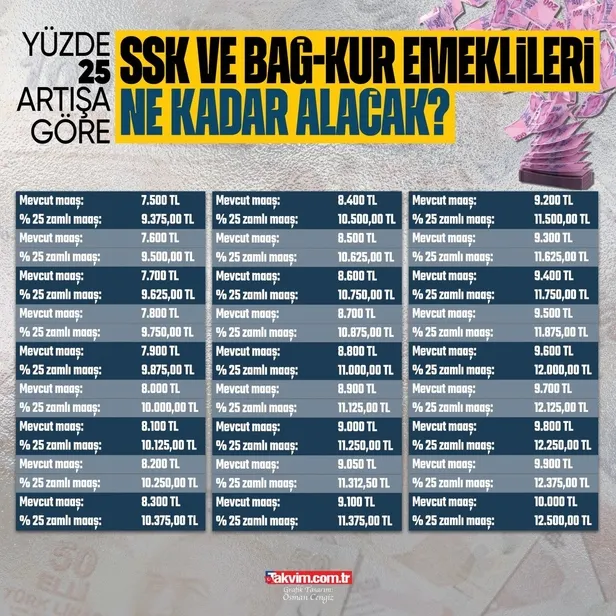Emekliye %25 zam! Memura 22 bin 17 lira maaş... SSK ve Bağ - Kur emeklilerine kuruşu kuruşuna zamlı maaş tablosu