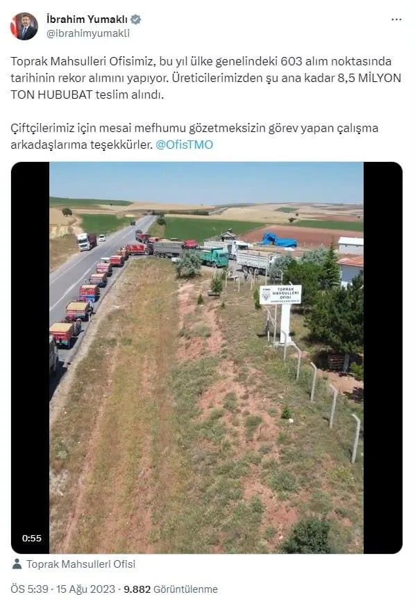 "Toprak Mahsulleri Ofisimiz, bu yıl ülke genelindeki 603 alım noktasında tarihinin rekor alımını yapıyor. Üreticilerimizden şu ana kadar 8,5 milyon ton hububat teslim alındı."