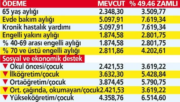 - ENGELLİ AYLIĞI: Yüzde 40-69 engeli olanlara ödenen aylık bin 874 liradan 2 bin 801, yüzde 70 ve üzeri engeli olanların aylığı da 2 bin 811 liradan 4 bin 202 liraya yükselecek.