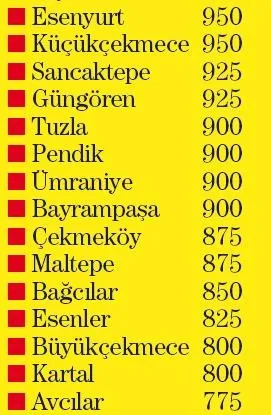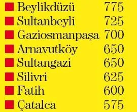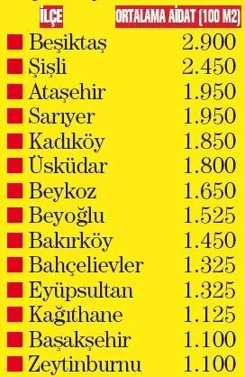 İstanbul'da en düşük ve en yüksek aidatların olduğu ilçeleri açıklayan EVA Gayrimenkul Değerleme Değerleme Koordinatörü Serkan Bal, "100 metrekarelik daire başına ödenen ortalama aylık aidat tutarında en yüksek rakam 2 bin 900 lira ile Beşiktaş'ta görülürken, onu 2 bin 450 lira ile Şişli, bin 950 lira ile Sarıyer ve Ataşehir, bin 850 lira ile Kadıköy takip ediyor. Söz konusu rakamın en düşük olduğu ilçeler ise Silivri, Fatih ve Çatalca" dedi.