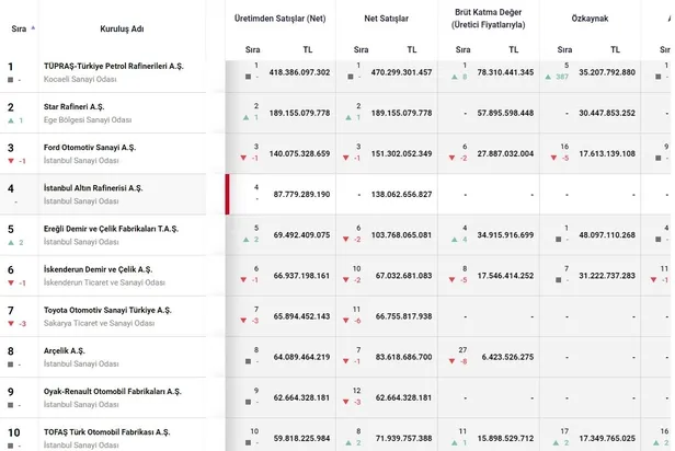İstanbul Altın Rafinerisi (İAR) 87,8 milyar liralık üretimden satışla 4'üncü sırada yer alırken, onu 69,5 milyar lirayla Ereğli Demir ve Çelik, 66,9 milyar lirayla İskenderun Demir ve Çelik izledi. İAR ile Ereğli Demir ve Çelik'in ikişer basamak yükselmesi dikkati çekti.