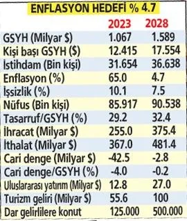 "Plan döneminde; ortalama yüzde 5 oranında istikrarlı ve dengeli bir büyüme hedefliyoruz. 2028'de 1 trilyon 589 milyar dolar milli gelire, 17 bin 554 dolar kişi başına gelire ulaşmayı amaçlıyoruz. Yılda ortalama yüzde 3 istihdam artışı sağlayarak dönem sonunda işsizliği yüzde 7.5 düzeyine indirmeyi öngörüyoruz. Mal ihracatını 375 milyar dolara yükselterek, turizm gelirlerinde 100 milyar dolar seviyesine çıkarak cari işlemler açığını sıfıra yakın bir seviyeye düşürmeyi amaçlıyoruz. Enflasyonu kalıcı olarak tek haneli rakamlara indirmeyi, 2028 sonunda yüzde 4.7'ye geriletmeyi hedefliyoruz."
