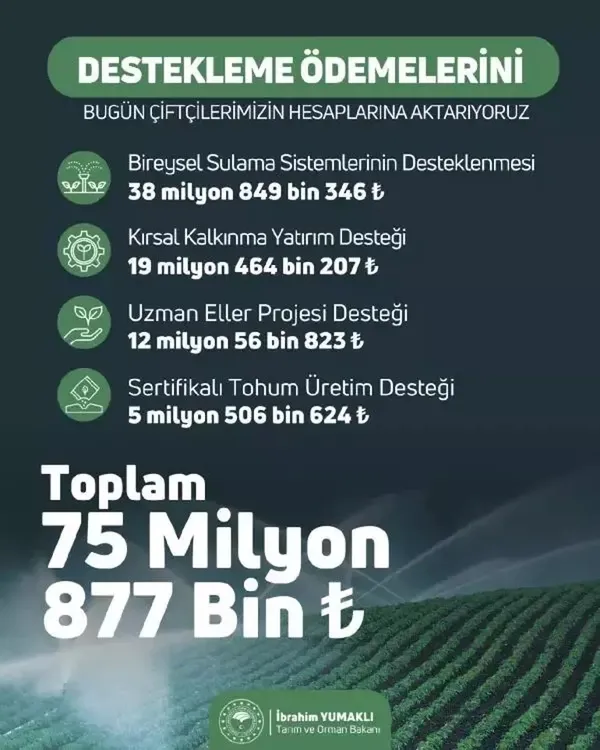 Bakan Yumaklı, sosyal medya hesabından yaptığı açıklamada, "Bireysel sulama, kırsal kalkınma, uzman eller, sertifikalı tohum üretimi projelerimiz kapsamında 75 milyon 877 bin TL tarımsal destekleme ödemesini bugün çiftçilerimizin hesaplarına aktarıyoruz. Üreticilerimize hayırlı ve bereketli olsun" dedi.