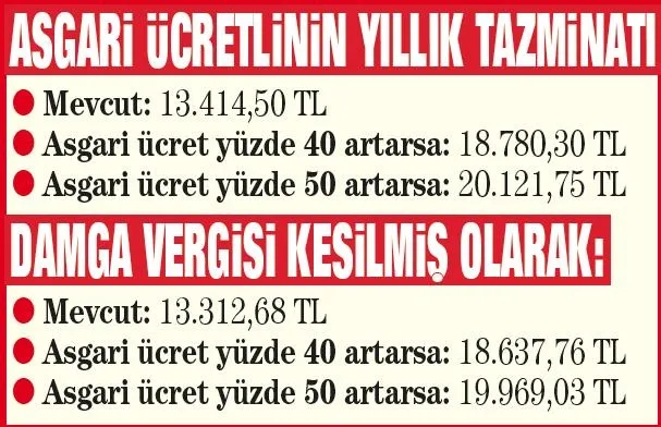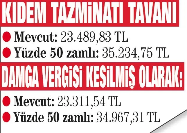 Damga vergisi kesilmiş olarak yıllık en düşük kıdem tazminatı tutarı 18 bin 637 liraya ulaşacak. Asgari ücret yüzde 50 artışla net 17 bin 103, brüt 20 bin 121 lira yapılırsa da çalışana her yıl için damga vergisi kesilmiş olarak en az 19 bin 969 lira kıdem tazminatı verilecek. Bu durumda çalışılmış her yıl için 6 bin 657 lira fark olacak. 10 yıl çalışması olan 66 bin 570, 20 yıl çalışan da 133 bin 140 lira avantaj sağlayacak.