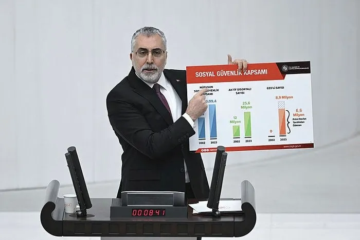"Aynı dönemde prim gelirlerinin, emekli aylıklarını ve sağlık giderlerini karşılama oranı 2002'de yüzde 60,9 iken, 2023 yıl sonunda yüzde 74,6'ya ulaştı. 2002 yılında SGK açığının Gayri Safi Yurtiçi Hasılaya oranı yüzde 2,2 seviyesinde iken 2023 yıl sonunda yüzde 0,44'e ulaşmıştır. Bu veriler bizlere mali açıdan sürdürülebilir bir sosyal güvenlik sistemine kavuştuğumuzu da göstermiştir."