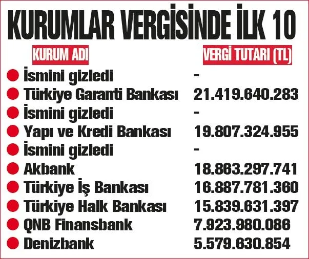 2 trilyon 891 milyar 409 milyon lira matrah beyan edildi ve bu tutar üzerinden 590 milyar 334 milyon lira kurumlar vergisi tahakkuk ettirildi. Listeye göre, kurumlar vergisi beyan eden mükellef listesinde ilk, 3'üncü ve 5'inci sıradaki kurumlar isimlerinin açıklanmasını istemedi. Listenin 2'nci sırasında ise 21 milyar 419 milyon 640 bin 283 lira vergi tahakkuku ile Garanti BBVA yer aldı.