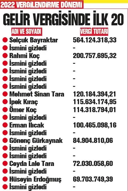 2022'nin gelir ve kurumlar vergisi rekortmenleri belli oldu. Gelir İdaresi Başkanlığı, en fazla vergi beyan eden 100 mükellef listesini açıkladı. Türkiye'nin 2022 yılı gelir vergisi rekortmeni Baykar Yönetim Kurulu Başkanı Selçuk Bayraktar oldu.
