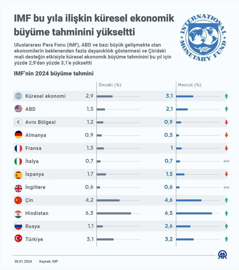 IMF, geçen yıl ekim ayında yayımlanan raporunda, dünya ekonomisinin 2024'te yüzde 2,9 ve 2025 yüzde 3,2 büyüyeceğini öngörmüştü.